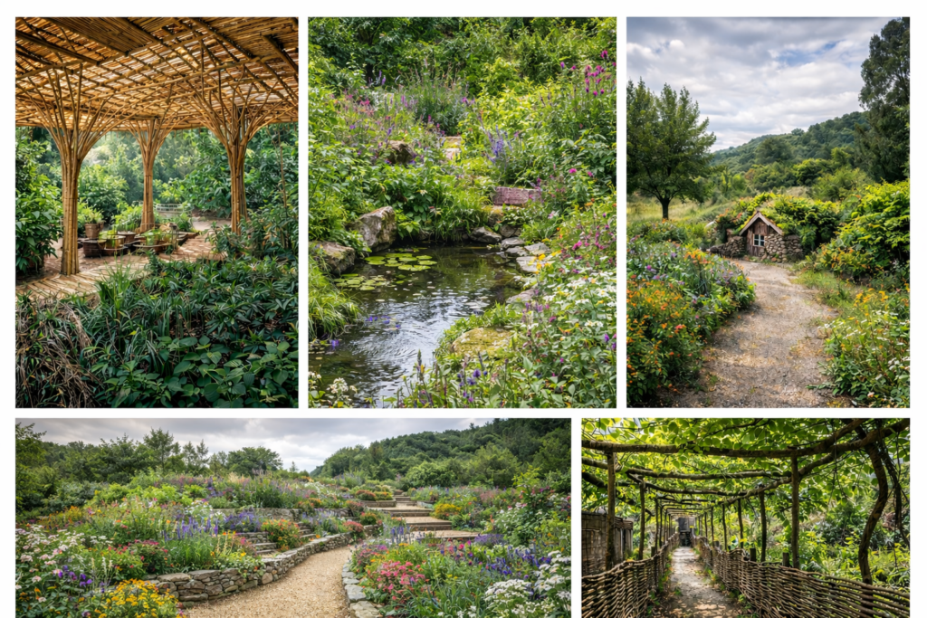 Un exemplu remarcabil este utilizarea bambusului în Asia, material regenerabil cu creștere rapidă, folosit pentru pergole, pavilioane, garduri sau mobilier de grădină. Bambusul absoarbe cantități semnificative de CO₂, previne eroziunea solului și reprezintă o alternativă biodegradabilă la oțel sau plastic.